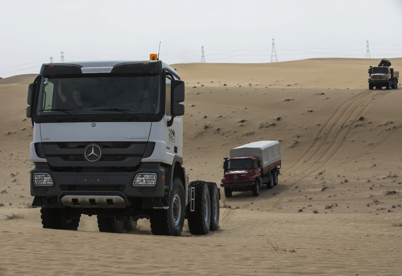 A fleet of 4x4 vehicles lined up ready for desert logistics operations at dawn.