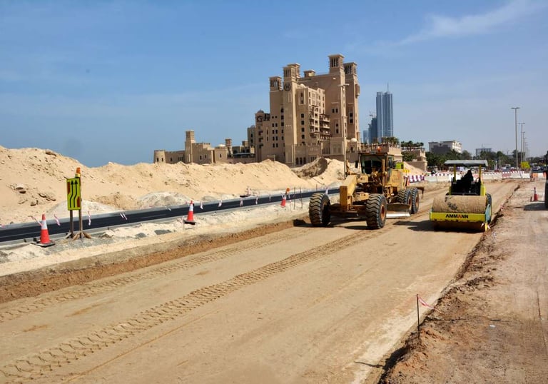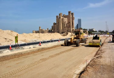 Wide shot of infrastructure development with heavy machinery constructing a new road near oil facilities.